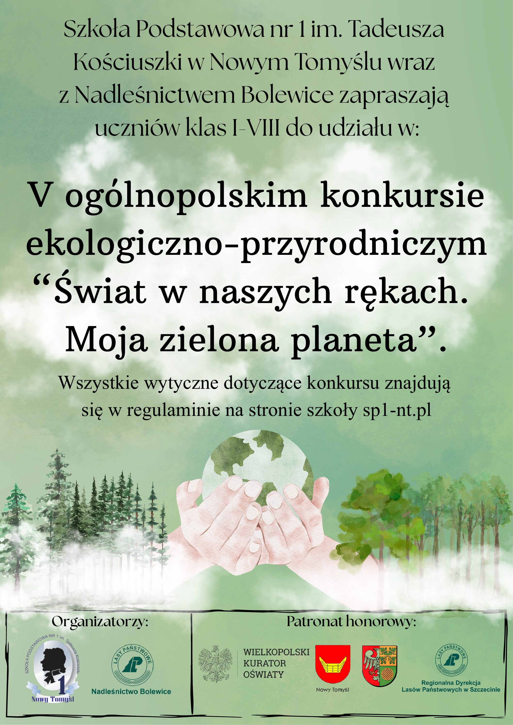 Nasza szkoła ma zaszczyt zaprosić na doroczny konkurs ekologiczno-przyrodniczy „Świat w naszych rękach”, którego podtytuł w tym roku brzmi „Moja zielona planeta”. Patronat honorowy nad konkursem objął Wielkopolski Kurator Oświaty, Powiat Nowotomyski, Gmina Nowy Tomyśl...