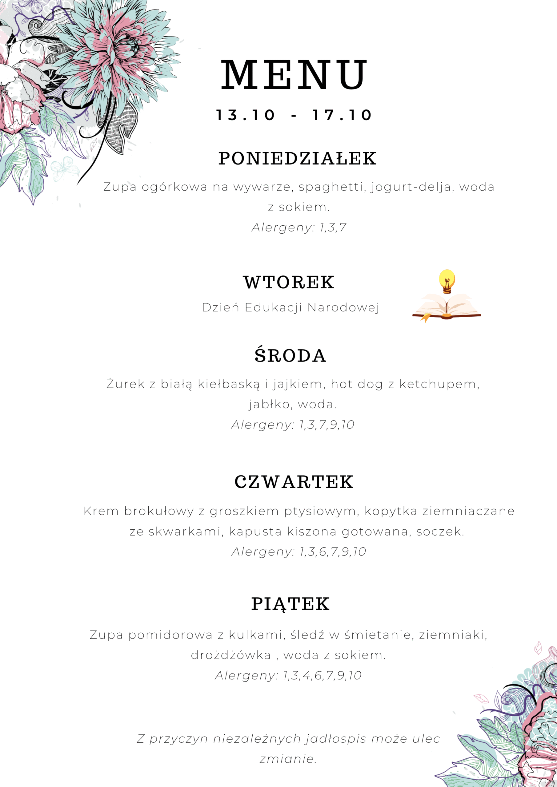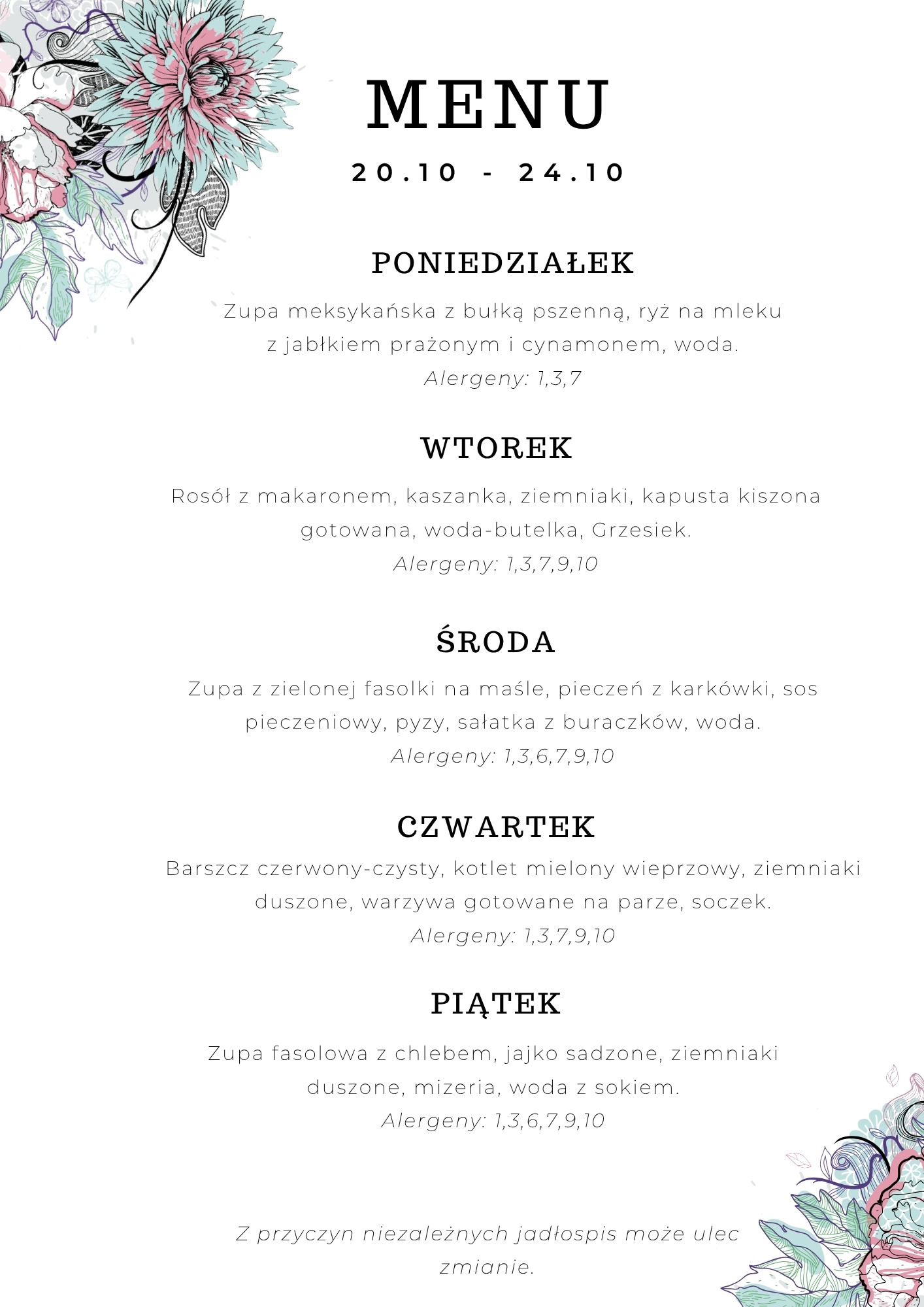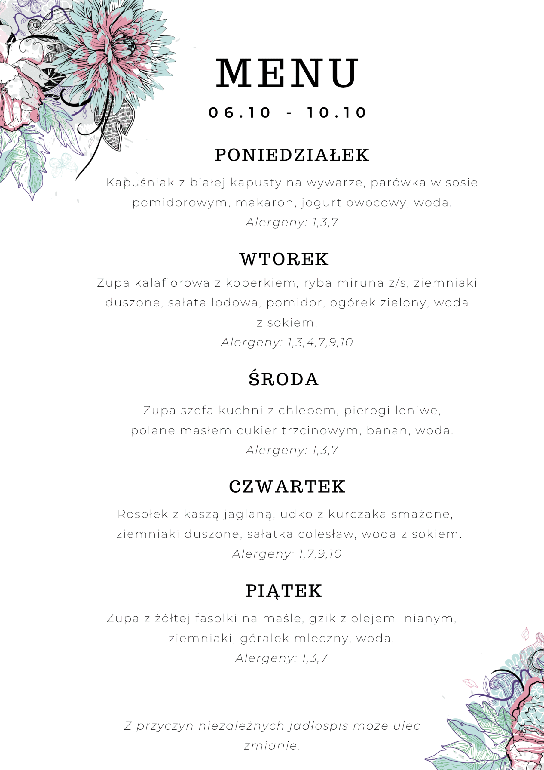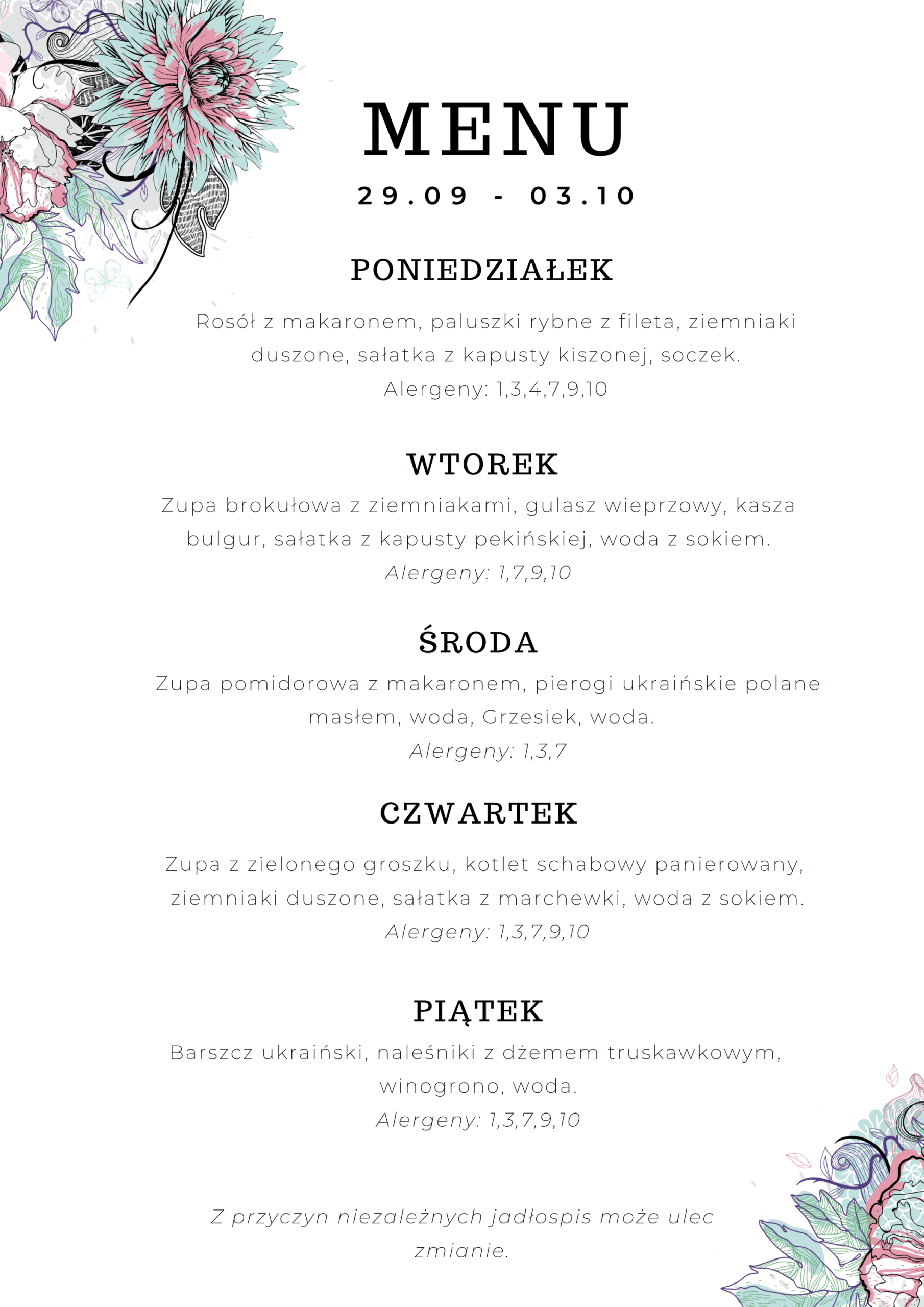 Menu 29.09 – 03.10 Menu 06.10 – 10.10 Menu 13.10 – 17.10 Menu 20.10 – 24.10 Menu 27.10 – 31.10 Wykaz alergenów